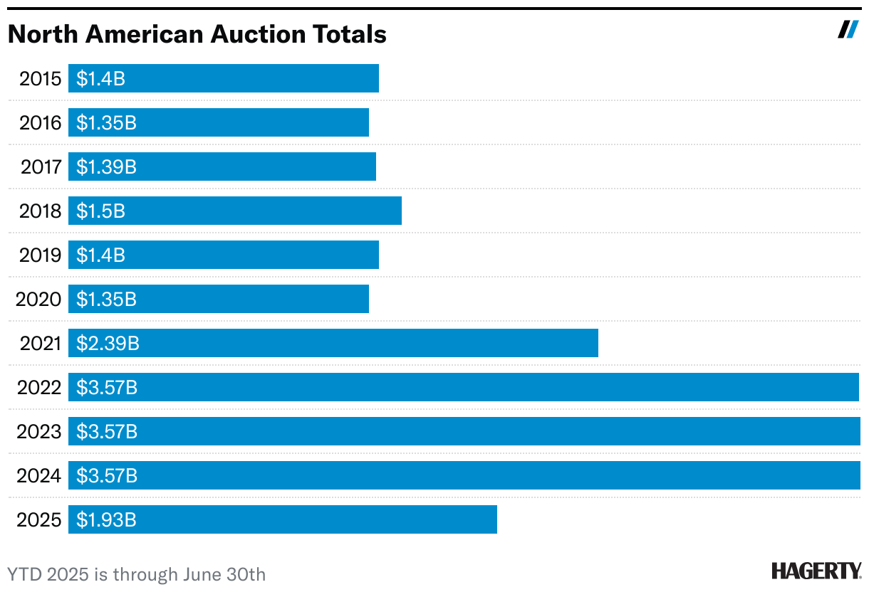 Even though the market has steadily cooled for six months, the magnitude of those changes has diminished. Recent changes in the Hagerty Market Index are minor, and annual auction totals for both live and online outlets have been remarkably consistent for the past three years. Results through the first half of 2025 are pacing right alongside last year’s amounts.