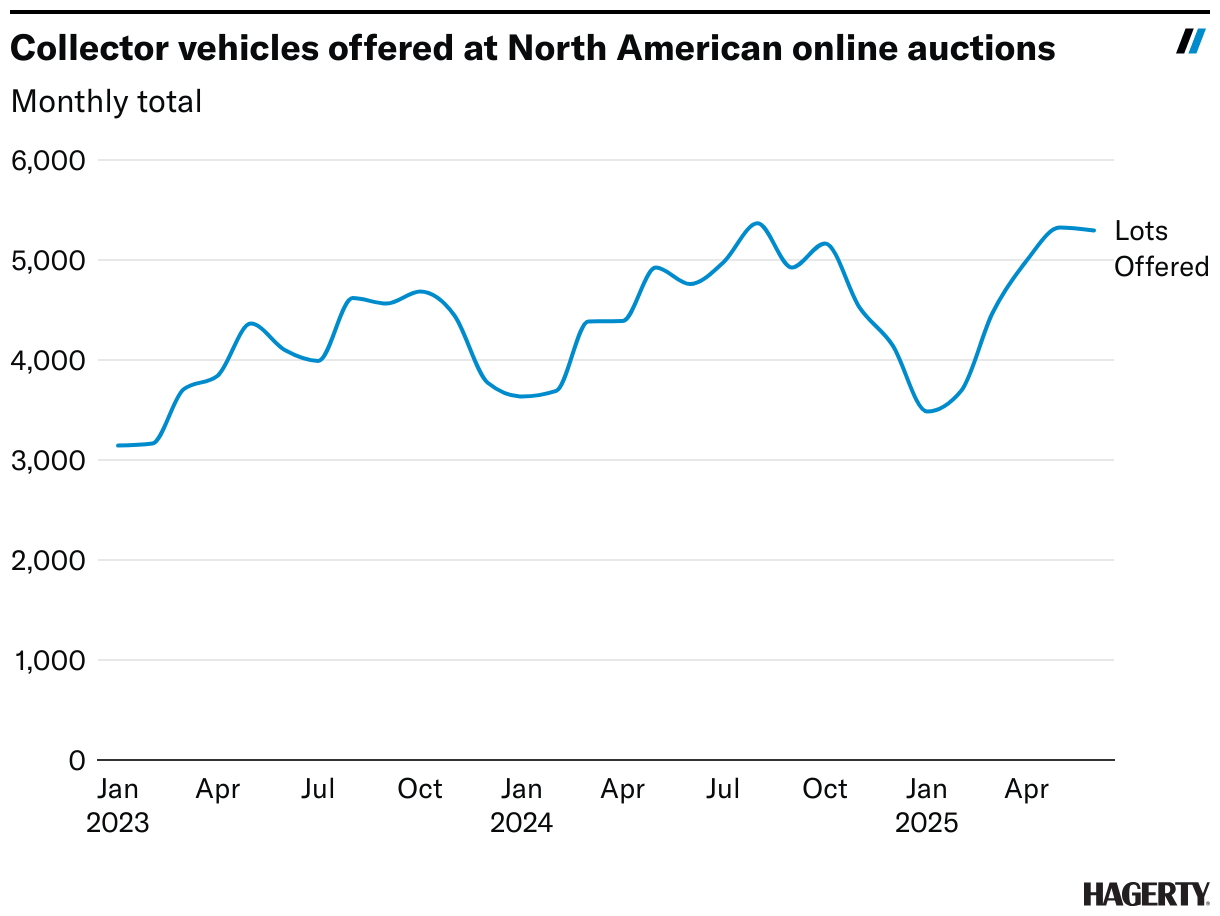 Cautious buyers haven’t discouraged owners from putting their cars on the market, though, unlike in previous market downturns. Online auction volume so far this year is up 6% compared to the same period of 2024. Owners have had their cars long enough that they’re still above water despite the market’s recent turn, or (more likely) they didn’t buy the car they’re selling for a profit in the first place.