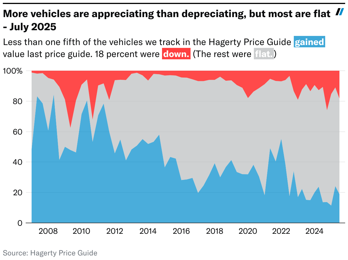 Some segments of the market have declined slightly and the average asking price has relaxed, but individually, most of the market has been insulated. In fact, three-fifths of the 40,000 vehicles covered in the Hagerty Price Guide didn’t change at all during the second quarter of 2025. Parts of the collector car market are always shifting, and a stable market can still see big swings both up and down for certain vehicles, but odds are the car in your garage or the one you’re thinking of buying has held steady.