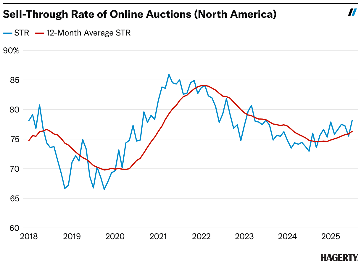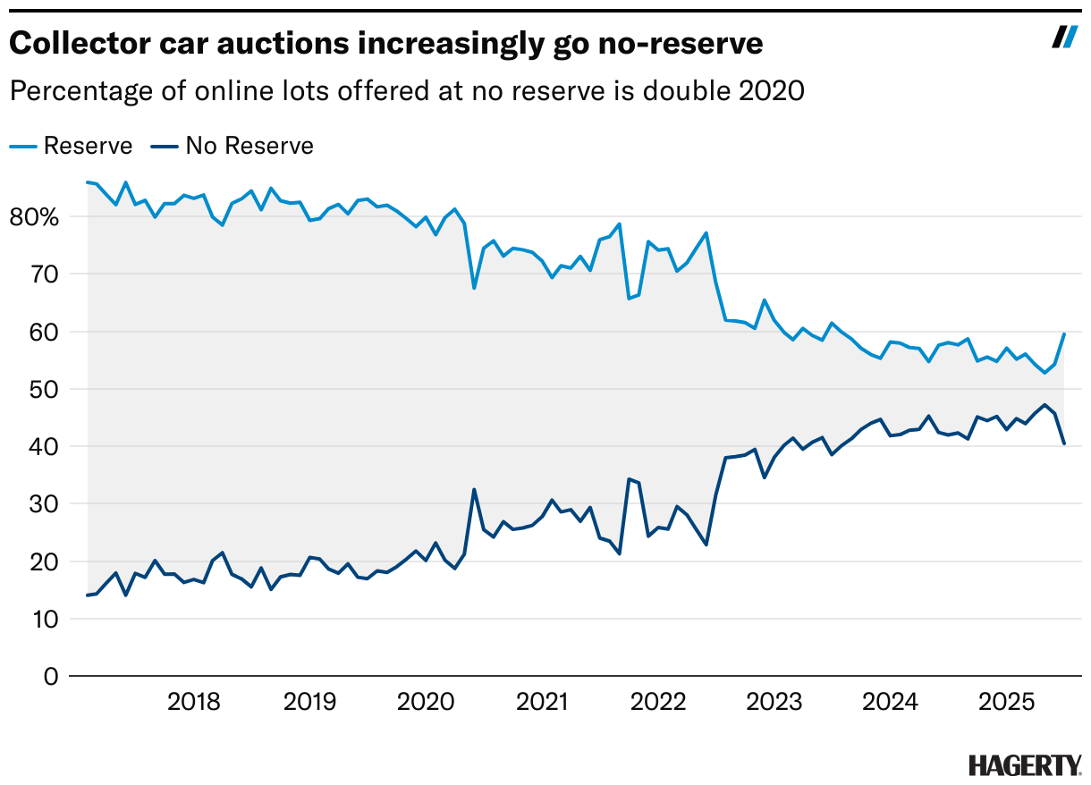 Another large reason sell-through rate hasn’t suffered is that owners are increasingly offering their cars without a reserve. In June, 40% of online consignments didn’t carry a reserve—the lowest that figure has been in two years. For the other five months of the year, though, a historically high 44% to 47% of lots were no-reserve. Clearly, sellers in 2025 recognize we’re in a buyer’s market and are being realistic when they decide to sell.