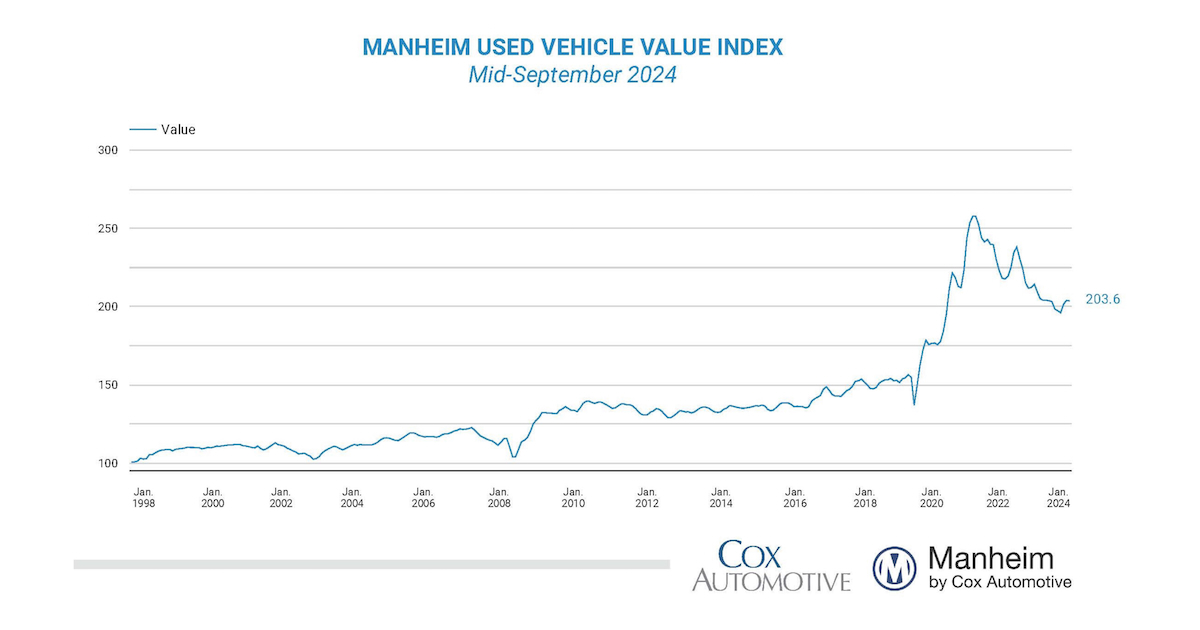Leveraging Manheim sales and inventory data, estimated wholesale supply ended August at 25 days, down two days from the end of July and essentially flat against August 2023 at 25 days also. Wholesale supply is relatively tighter for this time of year, running two days lower than the longer-term levels for this week. As of Sept. 15, wholesale supply increased by one day from the end of August, moving to 26 days, flat against year-over-year levels.
